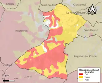 Le retrait-gonflement des sols argileux est susceptible d'engendrer des dommages importants aux bâtiments en cas d’alternance de périodes de sécheresse et de pluie. 94,5 % de la superficie communale est en aléa moyen ou fort (84,7 % au niveau départemental et 48,5 % au niveau national). Sur les 522 bâtiments dénombrés sur la commune en 2019, 515 sont en aléa moyen ou fort, soit 99 %, à comparer aux 86 % au niveau départemental et 54 % au niveau national. Une cartographie de l'exposition du territoire national au retrait gonflement des sols argileux est disponible sur le site du BRGM[24],[25].