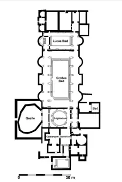 Au IIe siècle, il est enclos d'un bâtiment en bois à voûte[4] qui comprend un caldarium, un tepidarium et un frigidarium[9].