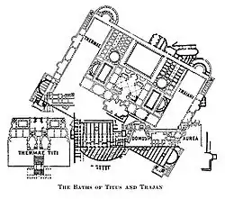Les thermes de Trajan prennent en partie appui sur les ruines de la partie supérieure de la Domus Aurea de Néron[14] qui ont été enterrées afin de servir de fondations, mais ne sont pas construits selon la même orientation, contrairement aux thermes de Titus : les thermes de Trajan sont orientés sur un axe nord-sud avec un désaxement d'environ 30 degrés[15]. Cette orientation, une nouveauté apportée par l'architecte des thermes qui sera reprise lors de la construction des futurs grands thermes impériaux, permet de mieux profiter de l'ensoleillement et de s'abriter des vents dominants[1] : selon cette configuration, le caldarium reçoit la chaleur du soleil depuis midi jusqu'au crépuscule[2].