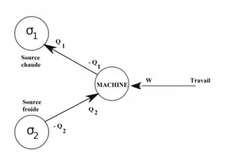Machine thermique typique : la chaleur se déplace du chaud vers le froid et le travail est produit.