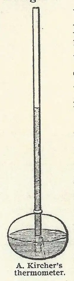 En 1643, Athanase Kircher publie un livre intitulé "Magnes, sive de arte magnetica" dans lequel il mentionne plusieurs types d'instruments qui ont la forme habituelle des thermoscopes air-eau. Cependant, il décrit un modèle original dans lequel un tube vertical plonge dans un ballon fermé à demi rempli d'eau. Lorsque l'air enfermé dans la partie supérieure du ballon est chauffé, il se dilate et la pression fait monter le liquide dans le tube. On se rapproche de la configuration que prendra le thermomètre à eau ou à alcool (p.31)[8].