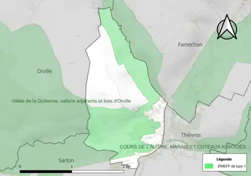 Le territoire communal comprend une ZNIEFF de type 1[Note 3] : la vallée de la Quillienne, ses vallons adjacents et bois d'Orville, d’une superficie de 2 143 hectares et d'une altitude variant de 65 à 154 mètres. Cette vallée associe des influences thermophiles dans les lisières et sur les pelouses et un caractère psychrophile au niveau des forêts de ravins. Une partie du site est occupée par l’agriculture intensive[12].