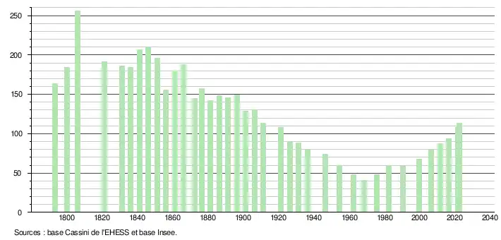 L'évolution du nombre d'habitants est connue à travers les recensements de la population effectués dans la commune depuis 1793. Pour les communes de moins de 10 000 habitants, une enquête de recensement portant sur toute la population est réalisée tous les cinq ans, les populations de référence des années intermédiaires étant quant à elles estimées par interpolation ou extrapolation[17]. Pour la commune, le premier recensement exhaustif entrant dans le cadre du nouveau dispositif a été réalisé en 2006[18].