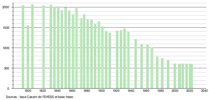 L'évolution du nombre d'habitants est connue à travers les recensements de la population effectués dans la commune depuis 1793. Pour les communes de moins de 10 000 habitants, une enquête de recensement portant sur toute la population est réalisée tous les cinq ans, les populations de référence des années intermédiaires étant quant à elles estimées par interpolation ou extrapolation[13]. Pour la commune, le premier recensement exhaustif entrant dans le cadre du nouveau dispositif a été réalisé en 2005[14].
