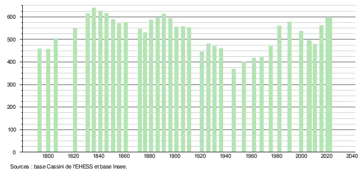 L'évolution du nombre d'habitants est connue à travers les recensements de la population effectués dans la commune depuis 1793. Pour les communes de moins de 10 000 habitants, une enquête de recensement portant sur toute la population est réalisée tous les cinq ans, les populations de référence des années intermédiaires étant quant à elles estimées par interpolation ou extrapolation[19]. Pour la commune, le premier recensement exhaustif entrant dans le cadre du nouveau dispositif a été réalisé en 2005[20].