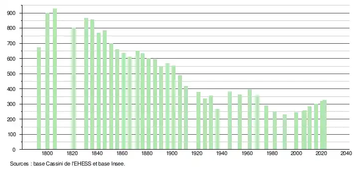 L'évolution du nombre d'habitants est connue à travers les recensements de la population effectués dans la commune depuis 1793. Pour les communes de moins de 10 000 habitants, une enquête de recensement portant sur toute la population est réalisée tous les cinq ans, les populations de référence des années intermédiaires étant quant à elles estimées par interpolation ou extrapolation[21]. Pour la commune, le premier recensement exhaustif entrant dans le cadre du nouveau dispositif a été réalisé en 2005[22].