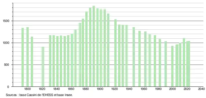 L'évolution du nombre d'habitants est connue à travers les recensements de la population effectués dans la commune depuis 1793. Pour les communes de moins de 10 000 habitants, une enquête de recensement portant sur toute la population est réalisée tous les cinq ans, les populations de référence des années intermédiaires étant quant à elles estimées par interpolation ou extrapolation[20]. Pour la commune, le premier recensement exhaustif entrant dans le cadre du nouveau dispositif a été réalisé en 2005[21].