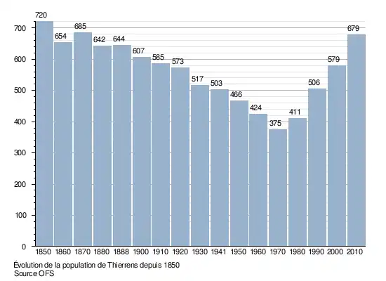 La population de Thierrens est de 720 personnes en 1850, puis de 654 personnes dix ans plus tard et de 685 personnes vingt ans plus tard. Le nombre d'habitants baisse ensuite progressivement jusqu'à 375 en 1970. Il remonte depuis et atteint 679 en 2010. Le graphique suivant résume l'évolution de la population de Thierrens entre 1850 et 2010[8] :