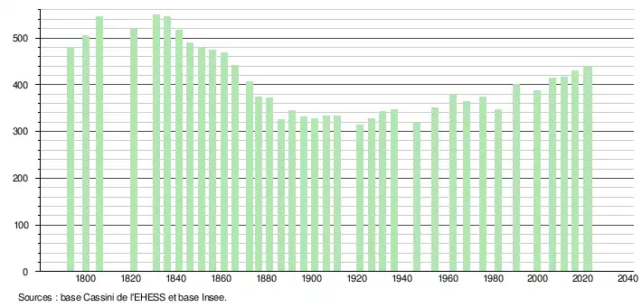 L'évolution du nombre d'habitants est connue à travers les recensements de la population effectués dans la commune depuis 1793. Pour les communes de moins de 10 000 habitants, une enquête de recensement portant sur toute la population est réalisée tous les cinq ans, les populations de référence des années intermédiaires étant quant à elles estimées par interpolation ou extrapolation[23]. Pour la commune, le premier recensement exhaustif entrant dans le cadre du nouveau dispositif a été réalisé en 2006[24].