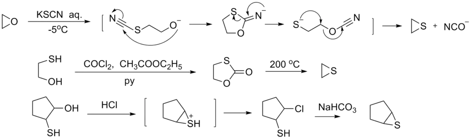 Le thiirane est préparé par réaction entre le carbonate d'éthylène et du thiocyanate de potassium (KSCN) anhydre[10]. À cette fin, le KSCN est tout d'abord fondu sous vide pour éliminer toute trace d'eau :
