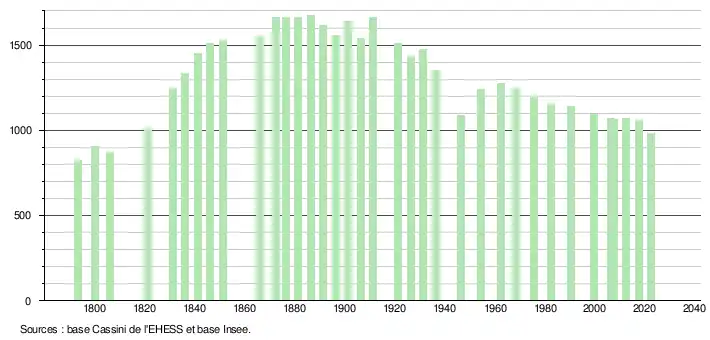 L'évolution du nombre d'habitants est connue à travers les recensements de la population effectués dans la commune depuis 1793. Pour les communes de moins de 10 000 habitants, une enquête de recensement portant sur toute la population est réalisée tous les cinq ans, les populations de référence des années intermédiaires étant quant à elles estimées par interpolation ou extrapolation[24]. Pour la commune, le premier recensement exhaustif entrant dans le cadre du nouveau dispositif a été réalisé en 2007[25].