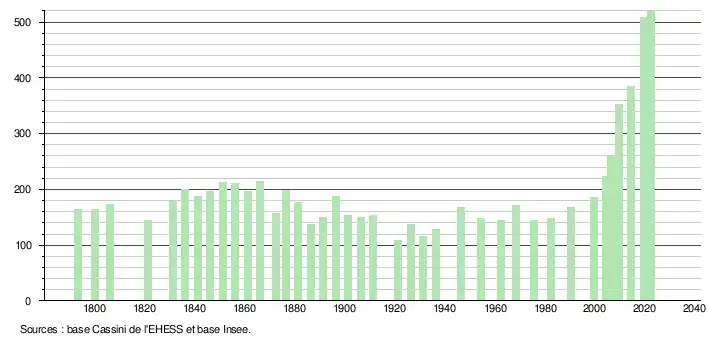 L'évolution du nombre d'habitants est connue à travers les recensements de la population effectués dans la commune depuis 1793. Pour les communes de moins de 10 000 habitants, une enquête de recensement portant sur toute la population est réalisée tous les cinq ans, les populations de référence des années intermédiaires étant quant à elles estimées par interpolation ou extrapolation[21]. Pour la commune, le premier recensement exhaustif entrant dans le cadre du nouveau dispositif a été réalisé en 2004[22].