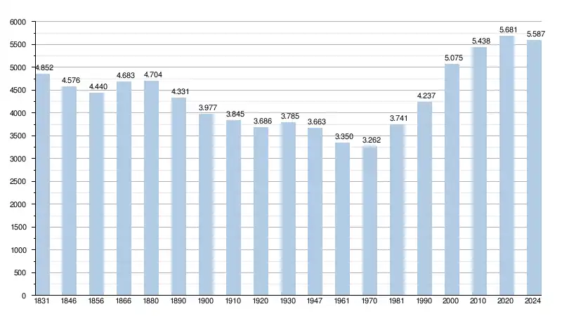 Les chiffres des années 1831 à 1970 tiennent compte des chiffres des anciennes communes fusionnées.