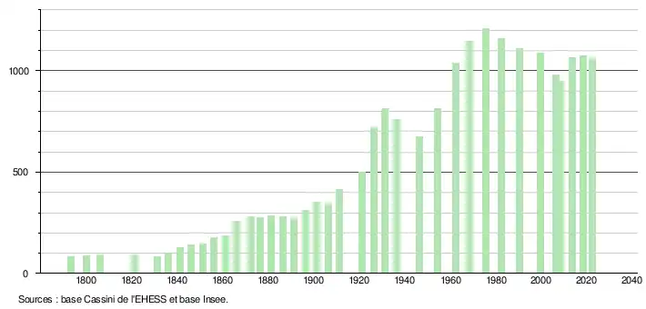 L'évolution du nombre d'habitants est connue à travers les recensements de la population effectués dans la commune depuis 1793. Pour les communes de moins de 10 000 habitants, une enquête de recensement portant sur toute la population est réalisée tous les cinq ans, les populations de référence des années intermédiaires étant quant à elles estimées par interpolation ou extrapolation[20]. Pour la commune, le premier recensement exhaustif entrant dans le cadre du nouveau dispositif a été réalisé en 2008[21].