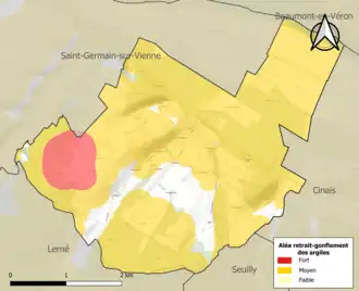 La commune est vulnérable au risque de mouvements de terrains constitué principalement du retrait-gonflement des sols argileux[22]. Cet aléa est susceptible d'engendrer des dommages importants aux bâtiments en cas d’alternance de périodes de sécheresse et de pluie. 88,3 % de la superficie communale est en aléa moyen ou fort (90,2 % au niveau départemental et 48,5 % au niveau national). Sur les 154 bâtiments dénombrés sur la commune en 2019, 115 sont en aléa moyen ou fort, soit 75 %, à comparer aux 91 % au niveau départemental et 54 % au niveau national. Une cartographie de l'exposition du territoire national au retrait gonflement des sols argileux est disponible sur le site du BRGM[23],[24].