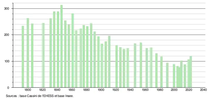 L'évolution du nombre d'habitants est connue à travers les recensements de la population effectués dans la commune depuis 1793. Pour les communes de moins de 10 000 habitants, une enquête de recensement portant sur toute la population est réalisée tous les cinq ans, les populations de référence des années intermédiaires étant quant à elles estimées par interpolation ou extrapolation[15]. Pour la commune, le premier recensement exhaustif entrant dans le cadre du nouveau dispositif a été réalisé en 2004[16].
