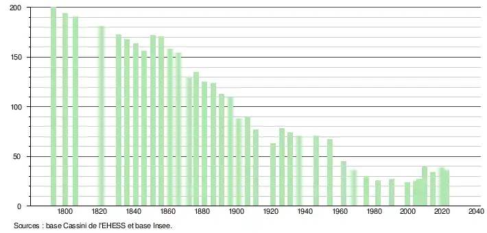 L'évolution du nombre d'habitants est connue à travers les recensements de la population effectués dans la commune depuis 1793. Pour les communes de moins de 10 000 habitants, une enquête de recensement portant sur toute la population est réalisée tous les cinq ans, les populations de référence des années intermédiaires étant quant à elles estimées par interpolation ou extrapolation[14]. Pour la commune, le premier recensement exhaustif entrant dans le cadre du nouveau dispositif a été réalisé en 2004[15].
