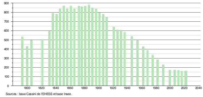 L'évolution du nombre d'habitants est connue à travers les recensements de la population effectués dans la commune depuis 1793. Pour les communes de moins de 10 000 habitants, une enquête de recensement portant sur toute la population est réalisée tous les cinq ans, les populations de référence des années intermédiaires étant quant à elles estimées par interpolation ou extrapolation[20]. Pour la commune, le premier recensement exhaustif entrant dans le cadre du nouveau dispositif a été réalisé en 2006[21].