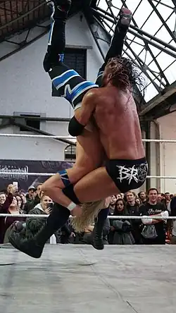 Lattimer portant le Dante's Inferno sur Glen Alexander lors d'un show indépendant en 2017.