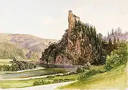 - Vue des ruines du château de Dürnstein (Sankt Pölten, Niederösterreichisches Landesmuseum, Inv. Nr. 850), vers 1840-45, aquarelle, 20,7×27,7 cm