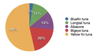 Le thon est très largement disponible mais le risque de surpêche est grand. La capture mondiale de thonidés est de l'ordre de 4,5 millions de tonnes par an[1].