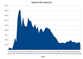 On estime que 80 % des ressources de thon rouge du Nord (Thunnus thynnus, aussi appelé thon rouge de l'Atlantique ou de Méditerranée) ont disparu des années 1950 à 2010.
