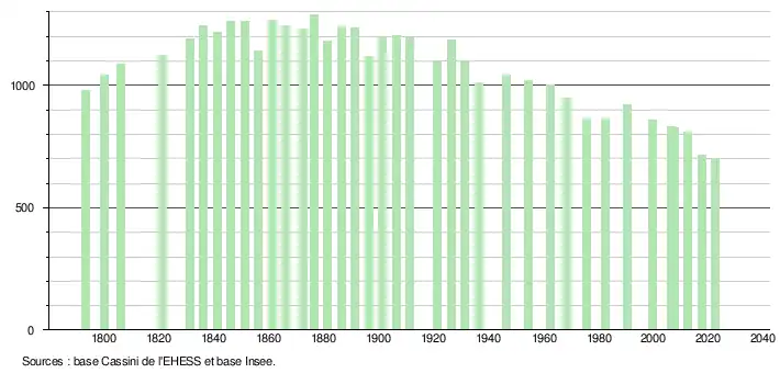 L'évolution du nombre d'habitants est connue à travers les recensements de la population effectués dans la commune depuis 1793. Pour les communes de moins de 10 000 habitants, une enquête de recensement portant sur toute la population est réalisée tous les cinq ans, les populations de référence des années intermédiaires étant quant à elles estimées par interpolation ou extrapolation[19]. Pour la commune, le premier recensement exhaustif entrant dans le cadre du nouveau dispositif a été réalisé en 2007[20].