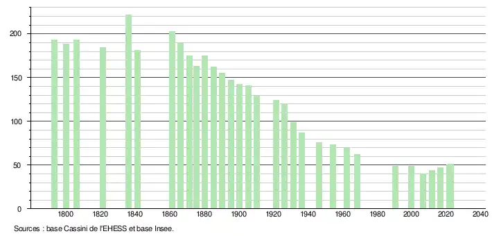 L'évolution du nombre d'habitants est connue à travers les recensements de la population effectués dans la commune depuis 1793. Pour les communes de moins de 10 000 habitants, une enquête de recensement portant sur toute la population est réalisée tous les cinq ans, les populations de référence des années intermédiaires étant quant à elles estimées par interpolation ou extrapolation[16]. Pour la commune, le premier recensement exhaustif entrant dans le cadre du nouveau dispositif a été réalisé en 2006[17].
