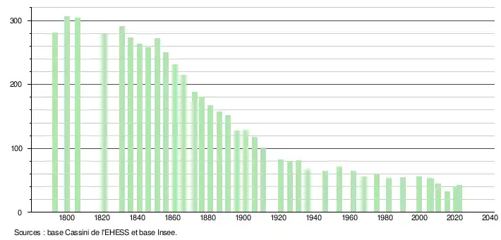 L'évolution du nombre d'habitants est connue à travers les recensements de la population effectués dans la commune depuis 1793. Pour les communes de moins de 10 000 habitants, une enquête de recensement portant sur toute la population est réalisée tous les cinq ans, les populations de référence des années intermédiaires étant quant à elles estimées par interpolation ou extrapolation[14]. Pour la commune, le premier recensement exhaustif entrant dans le cadre du nouveau dispositif a été réalisé en 2005[15].