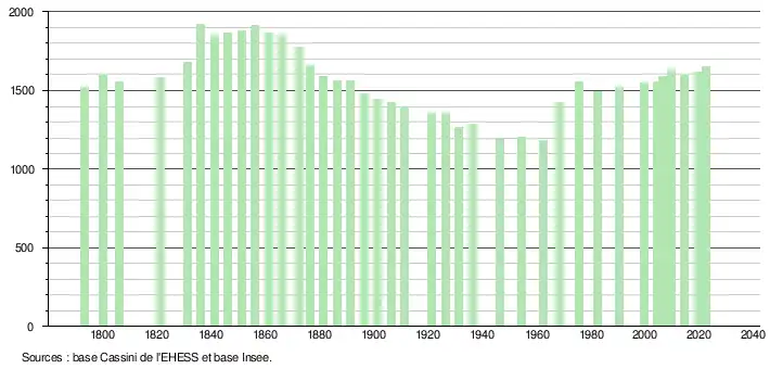 L'évolution du nombre d'habitants est connue à travers les recensements de la population effectués dans la commune depuis 1793. Pour les communes de moins de 10 000 habitants, une enquête de recensement portant sur toute la population est réalisée tous les cinq ans, les populations de référence des années intermédiaires étant quant à elles estimées par interpolation ou extrapolation[16]. Pour la commune, le premier recensement exhaustif entrant dans le cadre du nouveau dispositif a été réalisé en 2004[17].
