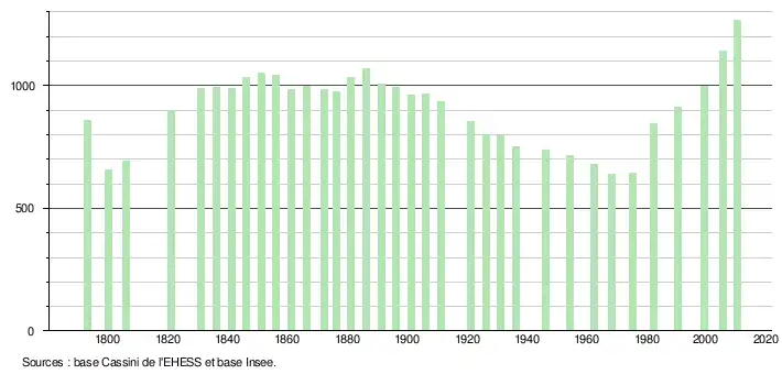 L'évolution du nombre d'habitants est connue à travers les recensements de la population effectués dans la commune depuis 1793. À partir du , les populations légales des communes sont publiées annuellement dans le cadre d'un recensement qui repose désormais sur une collecte d'information annuelle, concernant successivement tous les territoires communaux au cours d'une période de cinq ans. Pour les communes de moins de 10 000 habitants, une enquête de recensement portant sur toute la population est réalisée tous les cinq ans, les populations légales des années intermédiaires étant quant à elles estimées par interpolation ou extrapolation[4]. Pour la commune, le premier recensement exhaustif entrant dans le cadre du nouveau dispositif a été réalisé en 2005[5],[Note 1].