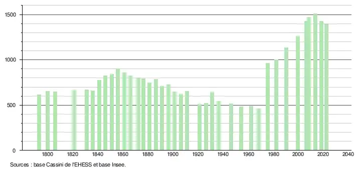 L'évolution du nombre d'habitants est connue à travers les recensements de la population effectués dans la commune depuis 1793. Pour les communes de moins de 10 000 habitants, une enquête de recensement portant sur toute la population est réalisée tous les cinq ans, les populations de référence des années intermédiaires étant quant à elles estimées par interpolation ou extrapolation[27]. Pour la commune, le premier recensement exhaustif entrant dans le cadre du nouveau dispositif a été réalisé en 2008[28].