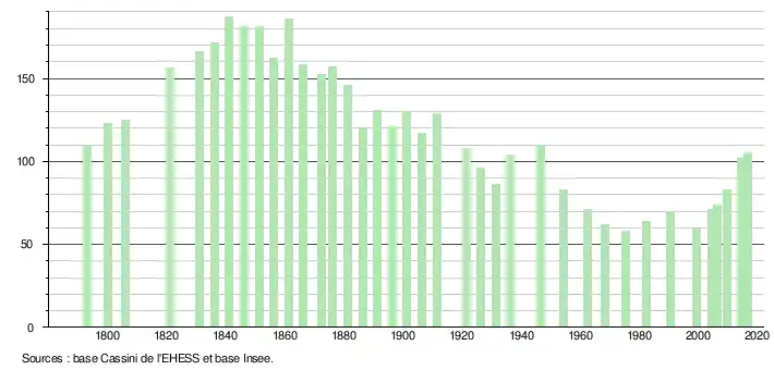 L'évolution du nombre d'habitants est connue à travers les recensements de la population effectués dans la commune depuis 1793. Pour les communes de moins de 10 000 habitants, une enquête de recensement portant sur toute la population est réalisée tous les cinq ans, les populations de référence des années intermédiaires étant quant à elles estimées par interpolation ou extrapolation[3]. Pour la commune, le premier recensement exhaustif entrant dans le cadre du nouveau dispositif a été réalisé en 2004[4].