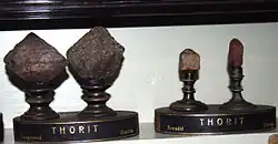 La thorite, (Th,U)SiO4, est un silicate de thorium rare qui cristallise dans le système tétragonal et qui est isomorphe avec le zircon et l'hafnon (en). C'est le minéral de thorium le plus courant et il est presque toujours fortement radioactif. Il a été nommé ainsi en 1829 pour refléter sa contenance en thorium. La thorite a été découverte en 1828 sur l'île de Løvøya, Norvège, par le minéralogiste Hans Morten Thrane Esmark qui envoya les premiers échantillons de ce minéral noir à son père Jens Esmark, professeur de minéralogie et de géologie[2],[3],[4].