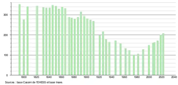 L'évolution du nombre d'habitants est connue à travers les recensements de la population effectués dans la commune depuis 1793. Pour les communes de moins de 10 000 habitants, une enquête de recensement portant sur toute la population est réalisée tous les cinq ans, les populations de référence des années intermédiaires étant quant à elles estimées par interpolation ou extrapolation[36]. Pour la commune, le premier recensement exhaustif entrant dans le cadre du nouveau dispositif a été réalisé en 2008[37].