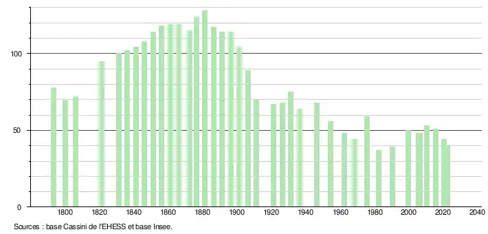 L'évolution du nombre d'habitants est connue à travers les recensements de la population effectués dans la commune depuis 1793. Pour les communes de moins de 10 000 habitants, une enquête de recensement portant sur toute la population est réalisée tous les cinq ans, les populations de référence des années intermédiaires étant quant à elles estimées par interpolation ou extrapolation[42]. Pour la commune, le premier recensement exhaustif entrant dans le cadre du nouveau dispositif a été réalisé en 2005[43].