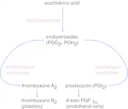 Elles sont produites dans les thrombocytes[1] (plaquettes) par la thromboxane-A synthase à partir des endoperoxydes, les prostaglandines, elles-mêmes produites par des cyclooxygénases (COX, ou plus précisément la prostaglandine H2 synthase qui possède un domaine COX, appelé ainsi pour Cyclo-OXygénase) à partir de l'acide arachidonique (arachidonate).
