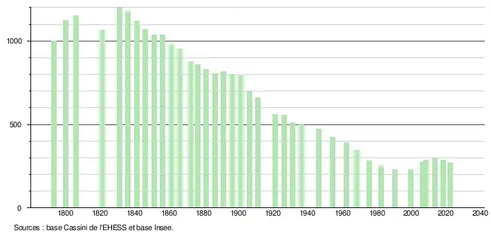 L'évolution du nombre d'habitants est connue à travers les recensements de la population effectués dans la commune depuis 1793. Pour les communes de moins de 10 000 habitants, une enquête de recensement portant sur toute la population est réalisée tous les cinq ans, les populations de référence des années intermédiaires étant quant à elles estimées par interpolation ou extrapolation[17]. Pour la commune, le premier recensement exhaustif entrant dans le cadre du nouveau dispositif a été réalisé en 2008[18].