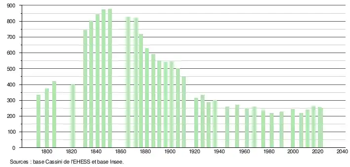 L'évolution du nombre d'habitants est connue à travers les recensements de la population effectués dans la commune depuis 1793. Pour les communes de moins de 10 000 habitants, une enquête de recensement portant sur toute la population est réalisée tous les cinq ans, les populations de référence des années intermédiaires étant quant à elles estimées par interpolation ou extrapolation[26]. Pour la commune, le premier recensement exhaustif entrant dans le cadre du nouveau dispositif a été réalisé en 2006[27].