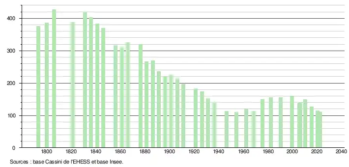 L'évolution du nombre d'habitants est connue à travers les recensements de la population effectués dans la commune depuis 1793. Pour les communes de moins de 10 000 habitants, une enquête de recensement portant sur toute la population est réalisée tous les cinq ans, les populations de référence des années intermédiaires étant quant à elles estimées par interpolation ou extrapolation[22]. Pour la commune, le premier recensement exhaustif entrant dans le cadre du nouveau dispositif a été réalisé en 2005[23].