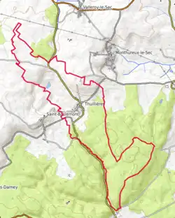 - ↑ La ligne de partage des eaux entre le bassin versant du Rhin et le bassin versant de la Meuse est représentée par une ligne verte en tirets-points.