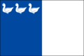 Drapeau de la Ville de Thuin. Parti de bleu et blanc, la laize bleue chargée de 3 merlettes blanches rangées à sa partie supérieure[34].
