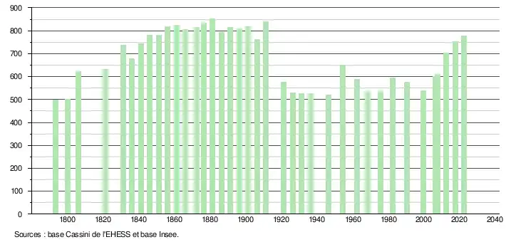 L'évolution du nombre d'habitants est connue à travers les recensements de la population effectués dans la commune depuis 1793. Pour les communes de moins de 10 000 habitants, une enquête de recensement portant sur toute la population est réalisée tous les cinq ans, les populations de référence des années intermédiaires étant quant à elles estimées par interpolation ou extrapolation[30]. Pour la commune, le premier recensement exhaustif entrant dans le cadre du nouveau dispositif a été réalisé en 2007[31].