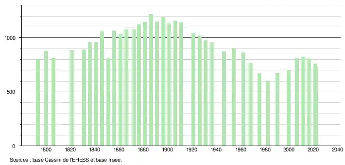 L'évolution du nombre d'habitants est connue à travers les recensements de la population effectués dans la commune depuis 1793. Pour les communes de moins de 10 000 habitants, une enquête de recensement portant sur toute la population est réalisée tous les cinq ans, les populations de référence des années intermédiaires étant quant à elles estimées par interpolation ou extrapolation[22]. Pour la commune, le premier recensement exhaustif entrant dans le cadre du nouveau dispositif a été réalisé en 2006[23].