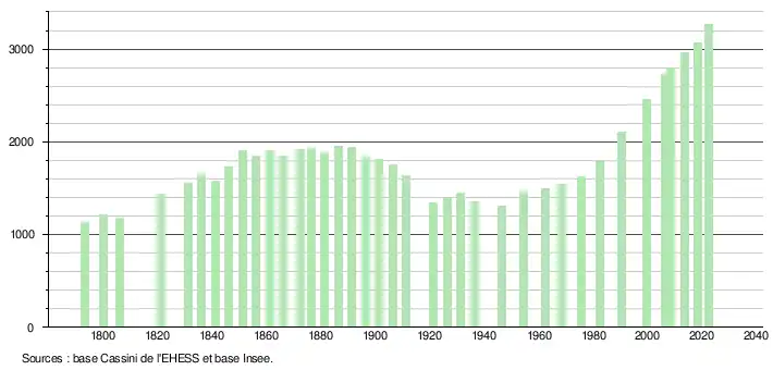 L'évolution du nombre d'habitants est connue à travers les recensements de la population effectués dans la commune depuis 1793. Pour les communes de moins de 10 000 habitants, une enquête de recensement portant sur toute la population est réalisée tous les cinq ans, les populations de référence des années intermédiaires étant quant à elles estimées par interpolation ou extrapolation[41]. Pour la commune, le premier recensement exhaustif entrant dans le cadre du nouveau dispositif a été réalisé en 2008[42].