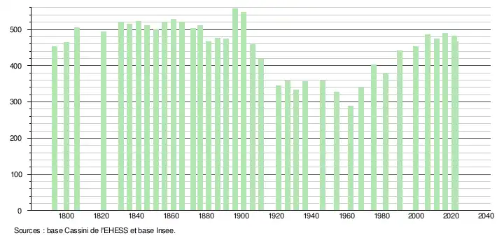 L'évolution du nombre d'habitants est connue à travers les recensements de la population effectués dans la commune depuis 1793. Pour les communes de moins de 10 000 habitants, une enquête de recensement portant sur toute la population est réalisée tous les cinq ans, les populations de référence des années intermédiaires étant quant à elles estimées par interpolation ou extrapolation[17]. Pour la commune, le premier recensement exhaustif entrant dans le cadre du nouveau dispositif a été réalisé en 2006[18].