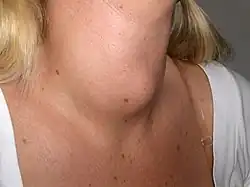 Ces signes sont liés à la présence du goître induit par la thyroïdite. Celui-ci est diffus et sa surface est le plus souvent régulière. Sa consistance est très particulière : ferme, « suiffée » ou « caoutchoutée ». Parfois ces changements peuvent ne pas être palpables[19]. Le goitre peut éventuellement être responsable de signes compressifs (dysphonie, dysphagie et dyspnée)[2]. La palpation cervicale ne retrouve généralement pas d'adénomégalie. Il n'est pas mis en évidence non plus de douleur ou de signes inflammatoires locaux.