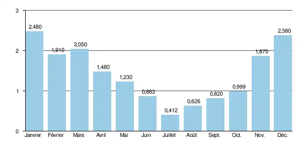 Les crues peuvent cependant s'avérer importantes. Les QJ 2 et QJ 5 valent respectivement 12 et 15 m3/s. Le QJ 10 est de 18 m3/s, tandis que le QJ 20 se monte à 20 m3/s.