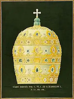 Lors de son couronnement, Napoléon avait promis d'envoyer à Pie VII un autel, deux coches cérémoniels et une tiare. Seule cette dernière fut effectivement livrée[4], en [2]. Alors que les modèles habituels pèsent environ entre 0,91 et 2,27 kg, la tiare de Napoléon pèse 8,2 kg. Certaines pierres provenaient d'anciennes tiares pontificales brisées et volées par les troupes du Directoire en 1798, quand le général Berthier envahit Rome, établit la République romaine, prétendit abolir la papauté, et déporta le pape Pie VI en France, où il mourut. Son successeur, Pie VII, fut élu à Venise et fut couronné en 1800.