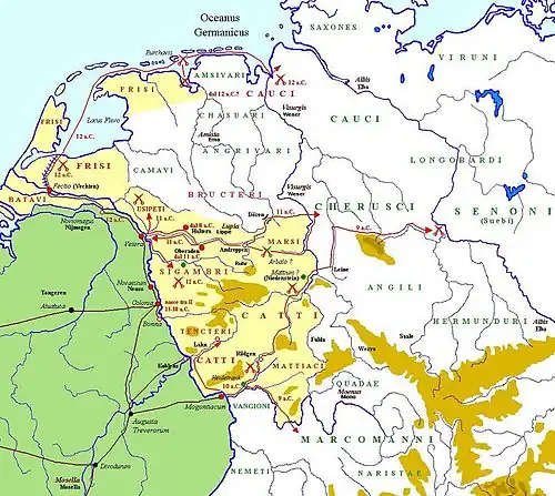 Après la campagne en Orient, bien qu'ayant officiellement déclaré au Sénat qu'il abandonne la politique d'expansion, sachant qu'une extension territoriale serait excessive pour l'Empire romain, Auguste décide de mener de nouvelles campagnes pour sécuriser les frontières. En 16 av. J.-C., Tibère, récemment nommé préteur, accompagne Auguste en Gaule — où les deux hommes passent les trois années suivantes, jusqu'en 13 av. J.-C. —, afin d'aider ce dernier dans l'organisation et la direction des provinces gauloises[10],[16]. Le Princeps senatus se fait aussi accompagner par son beau-fils lors de la campagne punitive au-delà du Rhin contre les tribus des Sicambres et de leurs alliés, les Tenctères et les Usipètes, qui, au cours de l'hiver de 17-16 av. J.-C., ont causé la défaite du proconsul Marcus Lollius, ainsi que la destruction partielle de la Legio V Alaudæ et la perte des insignes[a 21],[a 22],[a 23],[a 24].
